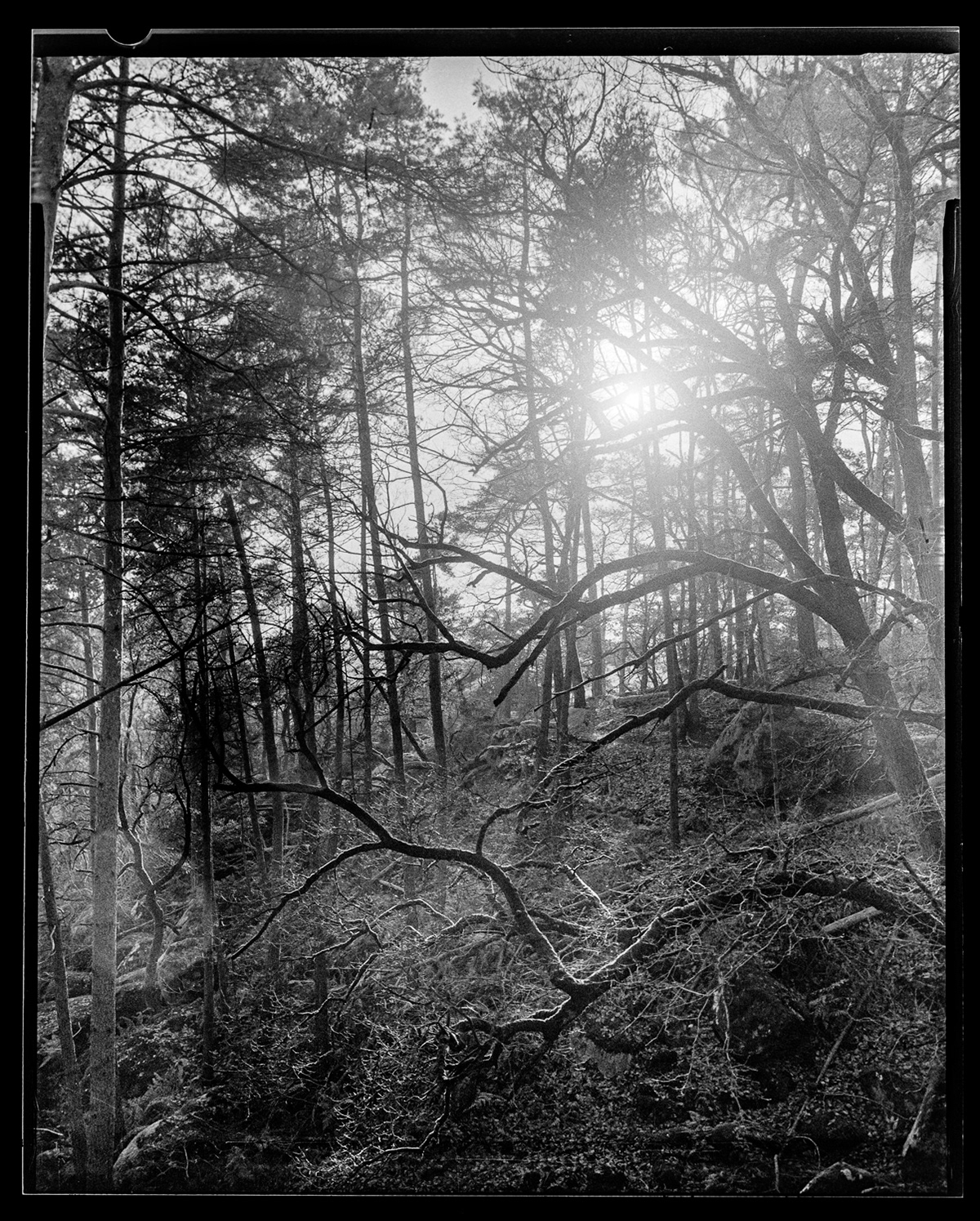 Jouant de cette concomitance historique, et du lien entre "l'invention" de la forêt de Fontainebleau et celle de la photographie, mes images réalisées à la chambre photographique en forêt de Fontainebleau sont mises en regard de fac-similés des guides de Denecourt, et des comptes-rendus de la Société Française de Photographie relatives aux expériences de Georges Balagny.